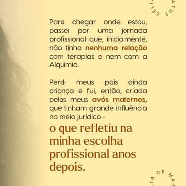 Em 2022, atendendo ao chamado do meu coração, me formei em Alquimia Avançada e senti a necessidade de direcionar minha atuação para as mulheres.